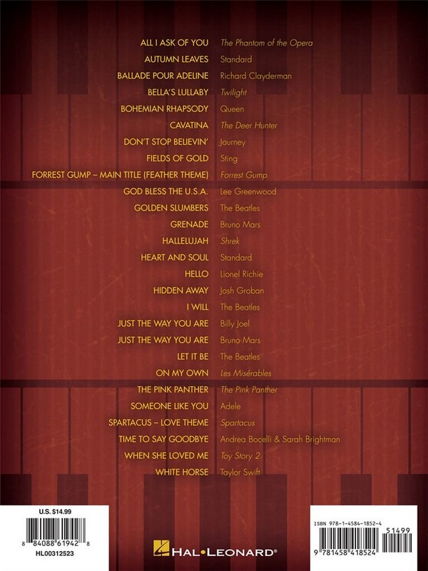 27 Hits, Standards, Themes All I ask of You (The Phantom of the Opera) Autumn Leaves Ballade pour Adeline (Clayderman) Bella's Lullaby (Twilight) Bohemian Rhapsody (Queen) Cavatina (Deer Hunter) Don't stop believin (Journey) Fields of Gold (Sting) Forrest Gump Feather Theme God bless the USA (Lee Greenwood) Golden Slumbers (The Beatles) Grenade (Bruno Mars) Hallelujah (Shrek) Heart and Soul ( Hello (Lionel Richie) Hidden Away (Josh Groban I will (The Beatles) Just the way You are (Billy Joel, Bruno Mars) Let it be (The Beatles) On my own (Les Misérables) The Pink Panther Someone like You (Adele) Spartacus Love Theme) Time to say Goodbye (Bocelli/Brightman) When She loved Me (Toy Story 2) White Horse (Taylor Swift)