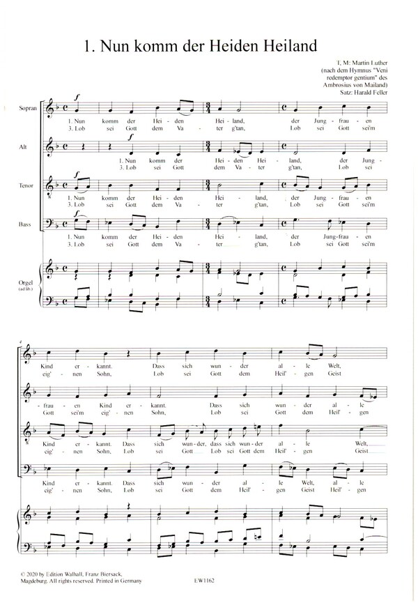 Sacri Concentus Ratisbonenses Reihe geistlicher Musik der Hochschule für katholische Kirchenmusik und Musikpädagogik Regensburg Band 21 Feller, Harald, arr. 13 Chorsätze bekannter Weihnachtslieder Nun komm der Heiden Heiland Maria durch ein Dornwald ging Veni, veni Emmanual Lobt Gott ihr Christen allzugleich Vom Himmel hoch Engel auf den Feldern singen O Jesulein zart In dulci jubilo In dulci jubilo 2 Tochter Zion Es ist ein Ros' entsprungen O du fröhliche Stille Nacht, heilige Nacht
