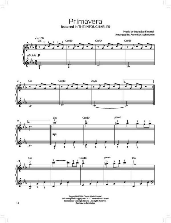 14 timeless Movie Themes Kann man eigentlich auf einem Traditionsinstrument wie der Harfe auch aktuelle Musiktitel spielen? Und ob! Und zwar nicht nur auf der klassischen Pedalharfe, sondern auch auf der kleineren, handlicheren Hakenharfe, deren erstaunliche Klangvielfalt sich mittlerweile herumgesprochen hat. Die Harfenistin und Harfenlehrerin Anne Kox-Schindelin hat 14 beliebte Titel aus Filmmusiken der letzten Jahrzehnte arrangiert. Ihre Arrangements sind genau auf die Möglichkeiten der 34-saitigen Hakenharfe zugeschnitten, dennoch sind alle Titel natürlich auch für die Pedalharfe bestens geeignet. Eine echte Lücke in der Harfenliteratur wird damit geschlossen! 1. And Then I Kissed Him [Hans Zimmer] 2. Everybody Hurts [R.E.M.] 3. Game Of Thrones [Ramin Djawadi] 4. May it Be [Enya] 5. (Somewhere) Over The Rainbow [Harold Arlen] 6. Primavera [Ludovico Einaudi] 7. Theme from Schindlers List [John Williams] 8. Skyfall [Adele] 9. The Sound Of Silence [Paul Simon] 10. The Godfather (Love Theme) [Nino Rota] 12. A Thousand Years [David Hodges/Christina Perri] 13. When You Say Nothing At All [Don Schlitz/Paul Overstreet] 14. Where Do I Begin (Love Theme) [Francis Lai]
