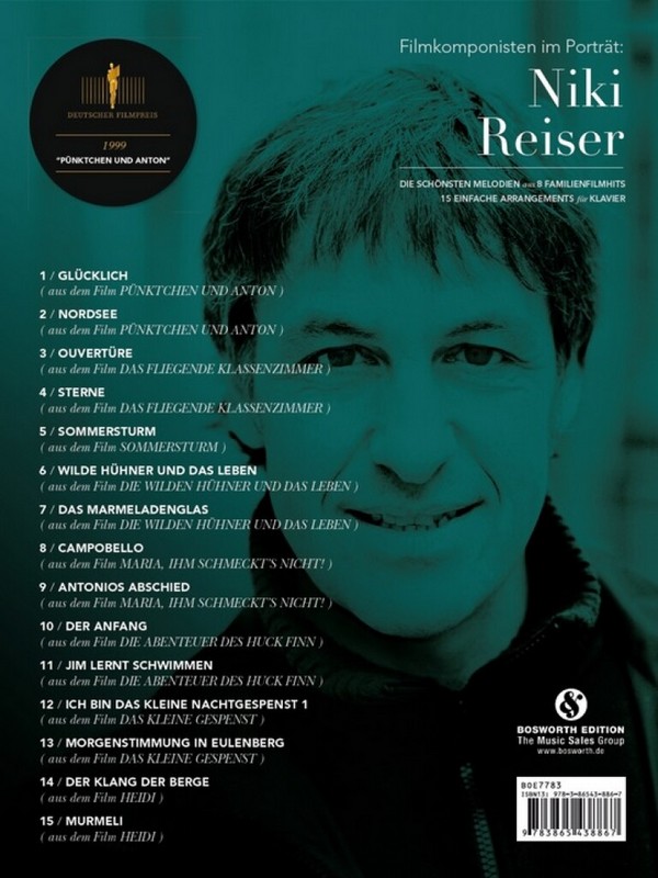 Der zweite Band unserer Serie Filmkomponisten im Porträt widmet sich Niki Reiser und versammelt erstmals die schönsten Melodien aus Familienfilmen, die er zwischen 1998 und 2015 schuf. Die schönstenMelodien aus 8 Familienfilmhits 15 einfache Arrangements Glücklich (Pünktchen Und Anton) Nordsee (Pünktchen Und Anton) Overture (Das Fliegende Klassenzimmer) Sterne (Das Fliegende Klassenzimmer) Sommersturm (Sommersturm) Wilde Hühner Und Das Leben (Die Wilden Hühner Und Das Leben) Das Marmeladenglas (Die Wilden Huhner Und Das Leben) Campobello (Maria, Ihm Schmeckt's Nicht!) Antonios Abschied (Maria, Ihm Schmeckt's Nicht!) Der Anfang (Die Abenteuer Des Huck Finn) Jim Lernt Schwimmen (Die Abenteuer Des Huck Finn) Ich Bin Das Kleine Nachtgespenst 1 (Das Kleine Gespenst) Morgenstimmung In Eulenberg (Das Kleine Gespenst) Der Klang Der Berge (Heidi) Murmeli (Heidi)