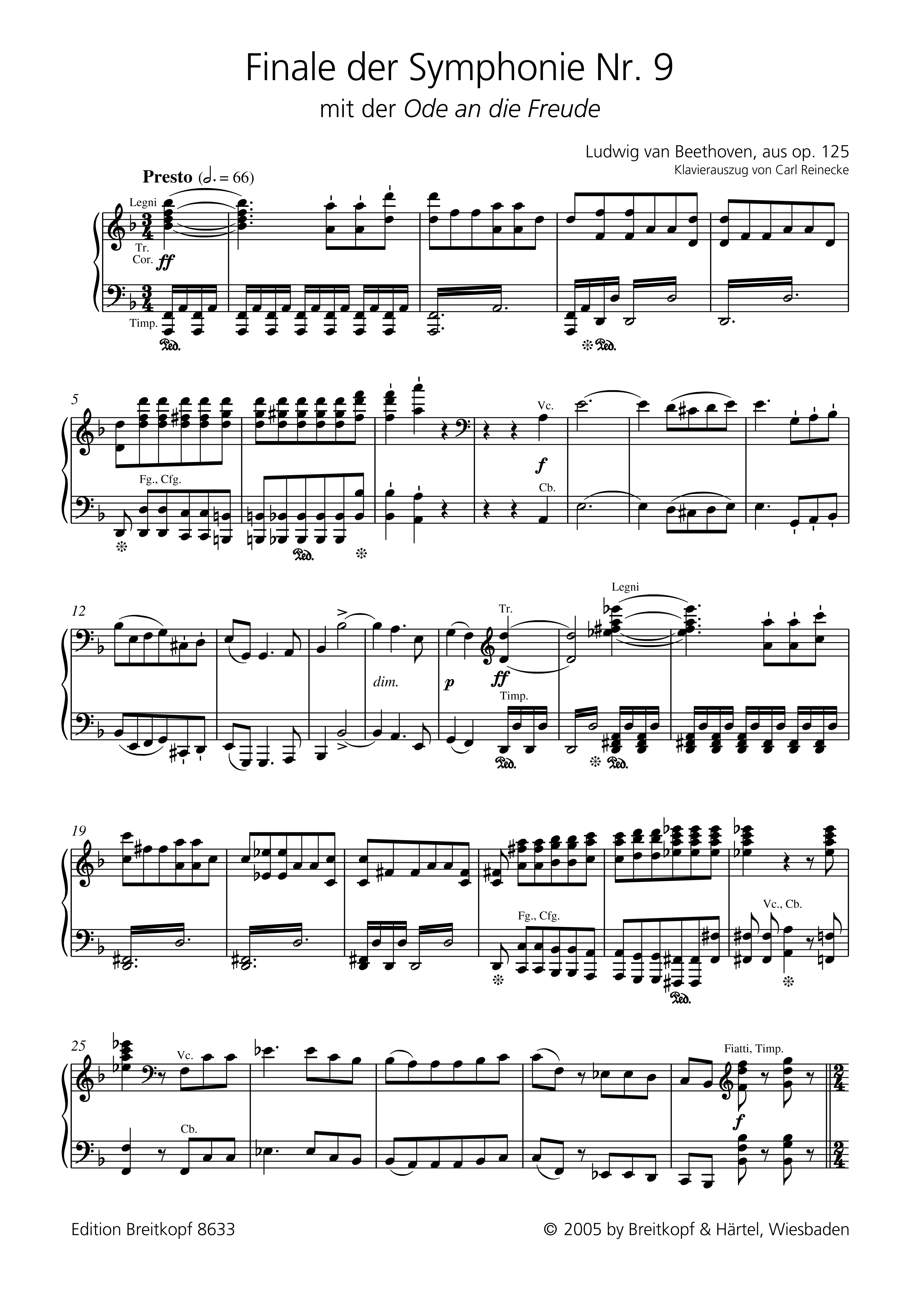 ersetzt EB1295 Reinecke, Carl, ed Ode an die Freude Der schwierige Spagat zwischen den Erfordernissen praktischer Brauchbarkeit und philologischer Akribie ist auf einem Niveau gegelückt, welches die Messlatte für vergleichbare Bemühungen beängstigend hoch legt. (Chor und Konzert) Die Studienpartitur bietet neben einem detailliert scharfen und angenehmen überschaubaren Notentext ein nüchtern-aufschlussreiches Vorwort Hauschilds, in dem die nicht gerade geradlinige Entstehungsgeschichte der letzten Sinfonie Beethovens erläutert wird. (Tobias Gebauer, Das Orchester)