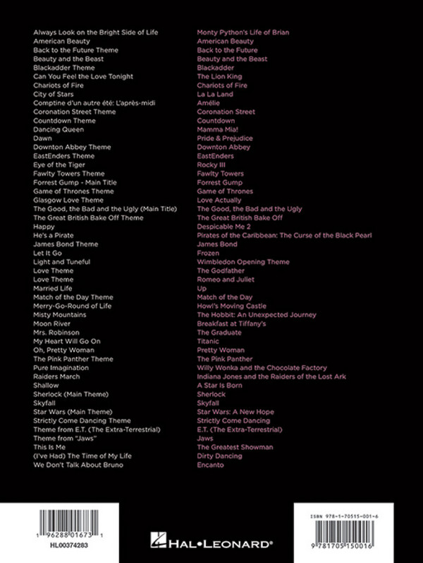 1. Always Look on the Bright Side of Life (from Monty Pythons Life of Brian) 2. American Beauty (from American Beauty) 3. Back to the Future Theme (from Back to the Future) 4. Beauty And The Beast (from BEAUTY AND THE BEAST) 5. Blackadder Theme (from Blackadder) 6. Can You Feel The Love Tonight (From The Lion King) 7. Chariots of Fire (from Chariots of Fire) 8. City Of Stars (from La La Land) 9. Comptine Dun Autre Été: Laprès-Midi (from Amélie) 10. Coronation Street Theme (from Coronation Street) 11. Countdown Theme (from Countdown) 12. Dancing Queen (from MAMMA MIA!) 13. Dawn (from Pride & Prejudice) 14. Downton Abbey Theme (from Downton Abbey) 15. EastEnders Theme (from EastEnders) 16. Eye of the Tiger (from Rocky III) 17. Fawlty Towers Theme (from Fawlty Towers) 18. Forrest Gump - Main Title (from Forrest Gump) 19. Game of Thrones Theme (from Game of Thrones) 20. Glasgow Love Theme (from LOVE ACTUALLY) 21. The Good, the Bad and the Ugly (Main Title) (from The Good, the Bad and the Ugly) 22. The Great British Bake Off Theme (from The Great British Bake Off) 23. Happy (From Despicable Me 2) 24. Hes a Pirate (from Pirates of the Caribbean: The Curse of the Black Pearl) 25. James Bond Theme (from James Bond) 26. Let It Go (From Frozen) 27. Light and Tuneful (from Wimbledon Opening Theme) 28. Love Theme (from The Godfather) 29. Love Theme (From Romeo And Juliet) 30. Married Life (from UP) 31. Match of the Day Theme (from Match of the Day) 32. Merry-Go-Round of Life (from Howls Moving Castle) 33. Misty Mountains (from The Hobbit: An Unexpected Journey) 34. Moon River (from Breakfast At Tiffanys) 35. Mrs. Robinson (from The Graduate) 36. My heart will go on (from Titanic) 37. Oh, Pretty Woman (from Pretty Woman) 38. The Pink Panther Theme (from The Pink Panther) 39. Pure Imagination (from Willy Wonka And The Chocolate Factory) 40. Raiders March (from Indiana Jones and the Raiders of the Lost Ark) 41. Shallow (from A STAR IS BORN) 42. Sherlock (Main Theme) (from Sherlock) 43. Skyfall (from Skyfall) 44. Star Wars (Main Theme) (from STAR WARS: A NEW HOPE) 45. Strictly Come Dancing Theme (from Strictly Come Dancing) 46. Theme From E.T. (The Extra-terrestrial) 47. Theme from Jaws (from Jaws) 48. This Is Me (from THE GREATEST SHOWMAN) 49. (Ive Had) The Time of My Life (from Dirty Dancing) 50. We Dont Talk About Bruno (from Encanto)