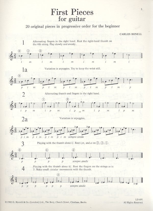 First Pieces for Guitar Going up A happy Tune March in G A slow Waltz Folk Song Changes The Tenth Postition Flying High Staying up Spring Jumping and Stretching Riding a Bicycle Ligado Dance