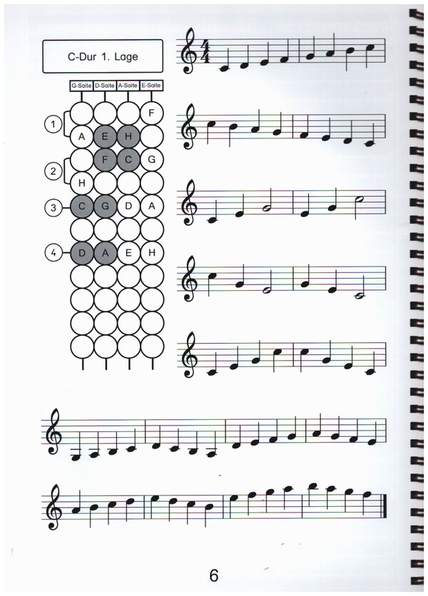 Tonleitern Waldmann, Katharina, Koautorin Tonleitern und Dreiklänge sind im Violinunterricht unerlässlich für eine saubere Intonation, sicheres Notenlesen und ein grundlegendes Verständnis für Tonarten. Die meisten Violinschulen für Kinder sind auf der Grundlage von Griffarten aufgebaut, das bedeutet, dass die Finger lange Zeit in denselben Abständen auf den Saiten aufgesetzt werden. Dies bietet zwar den Vorteil, dass einfache Lieder bereits nach wenigen Unterrichtsstunden gespielt werden können, der Nachteil ist jedoch, dass Versetzungszeichen und die daraus entstehenden Veränderungen der Griffpositionen lange Zeit eine untergeordnete Rolle im Unterricht spielen. Für das Spielen von Tonleitern bedeuten dies, dass auch diese nur in geringem Umfang erlernt werden im Rahmen einer Oktave und im Rahmen der bereits erlernten Griffarten. Sobald die Literatur etwas anspruchsvoller wird, entsteht das Problem, dass Griffarten untereinander kombiniert werden müssen. Dies stellt für viele SchülerInnen eine enorme kognitive Herausforderung dar, die oft den schnellen Fortschritt auf dem Instrument bremst. Das vorliegende Tonleiterheft verbindet verschiedene Herangehensweisen, um das Verständnis für eine Tonart zu fördern und den Unterschied der Griffarten deutlich darzustellen: - Jede Tonleiter ist in einem Schaubild dargestellt, auf dem die dazugehörigen Griffarten übersichtlich abgebildet werden. - Zusätzlich zur gesamten Tonleiter sind Fünftonleitern abgedruckt, die darstellen, wie die entsprechende Griffart auf den vier Saiten jeweils aussieht. Jede Tonart in diesem Heft ist in der ersten, zweiten und dritten Lage abgebildet. Dies ermöglicht eine gründliche Ausbildung der Flexibilität in der linken Hand und ein umfangreiches Verständnis von Tonarten in den ersten Unterrichtsjahren.