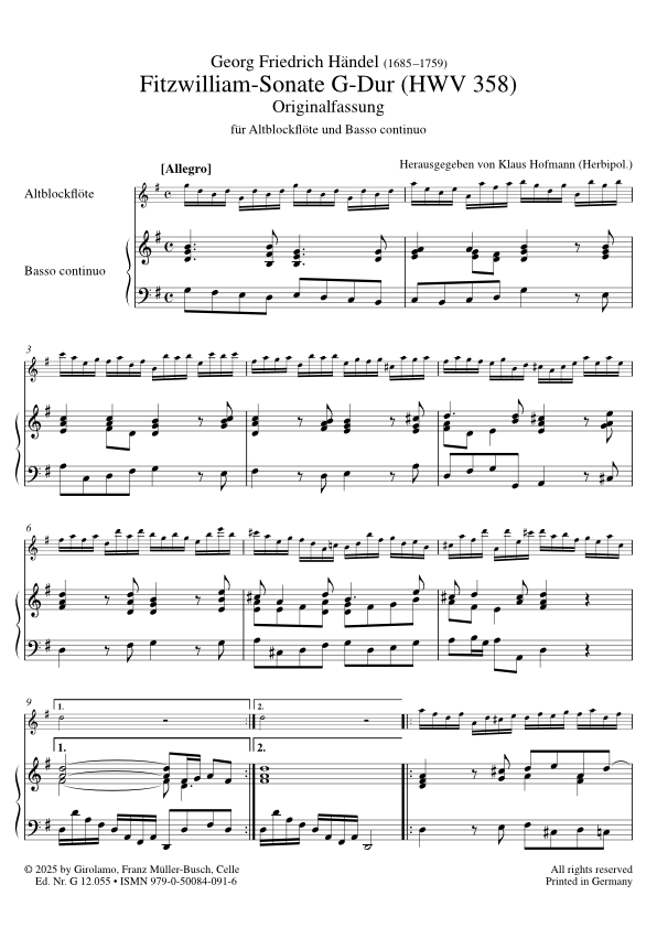 Produktinformationen "Fitzwilliam-Sonate G-Dur (HWV35) / Transpositionsvariante F-Dur"
