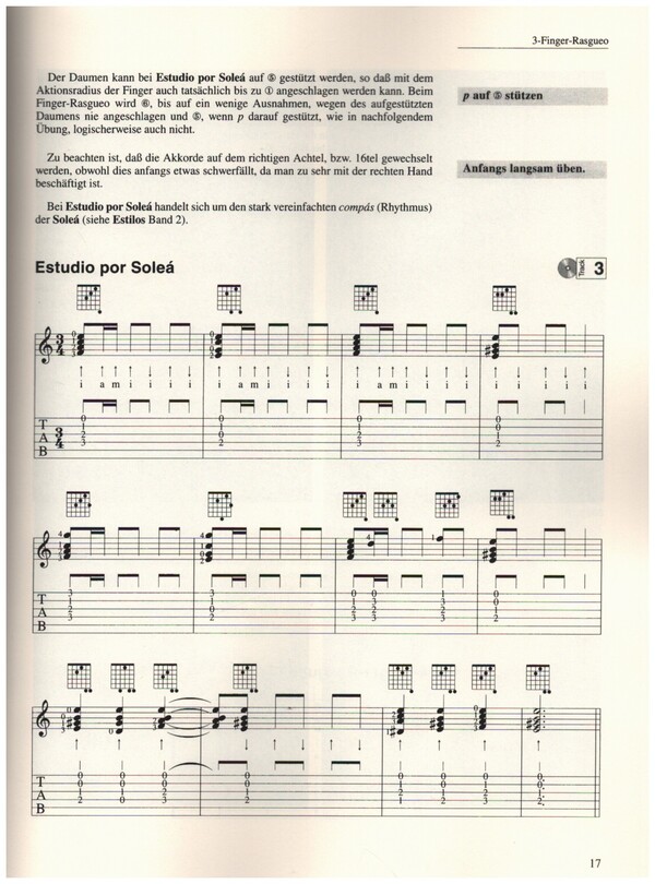 Nachfolgeartikel für ED8253 Vorwort Der Autor Schreibweise in diesem Buch Hinweise zu den Audio-Tracks - LEKTION 1: Haltung Der Klang der Flamencogitarre Fingerbezeichnung Rasgueo Ein-Finger-Rasgueo 3-Finger-Rasgueo 4-Finger-Rasgueo Kontinuierliches Rasgueo LEKTION 2: Pulgar Pulgar und ima-Anschlag Pulgar und Rasgueo Remate Pulgar-Abschlag Ayudado LEKTION 3: Golpe Golpeador i- und p-Abschlag mit Golpe m-Golpe mit Abschlag Der Rumba-Anschlag LEKTION 4: Tresillos a-m-i-p-Rasgueo LEKTION 5: La Guitarra Flamenca Guitarreros Guitarreros actual La Cejilla Guitarristas Guitarristas actual Unas Palmas Compás Modo Dórico GLOSSAR: Glossar Inhalt Band 2 Adressen Index VERZEICHNIS DER NOTEN UND SPIELSTÜCKE: Sencillos I (Tangos) Sencillos I (Vereinfachte Notation) 3-Finger-Rasgueo Estudio por Soleá 4-Finger-Rasgueo Sencillos II (Tangos) Naino I (Tangos) Pulgar-Übung Naino II (Tangos) Naino III (Tangos) Naino IV (Tangos) Soleá-Remate Mantón I (Soleá) Caí I (Alegrías en Do) Ayudado-Übung I Ayudado-Übung II Rumbita (Rumba) Mantón (Soleá) i-Abschlag mit Golpe (Garrotín) p-Abschlag mit Golpe und p-Aufschlag (Garrotín) Naino IV (Tangos) m-Golpe a-Golpe Quejío (Taranto) Rumba-Compás I Rumba-Compás II Rumba-Compás III Rumba-Compás V Rumba-Compás IV Rumba-Compás VI Tresillo I Tresillo II Tresillo III Tresillo IV Tangos-Compás mit Tresillos Soleá-Compás mit Tresillos I Soleá-Compás mit Tresillos II Soleá-Compás mit Tresillos III Soleá-Compás mit Tresillos IV Fandango de Huelva (Intro) Fandango de Huelva (Copla) Sevillanas (Intro) Sevillanas Paso Lento (Alegría) Mantón III (Soleá)