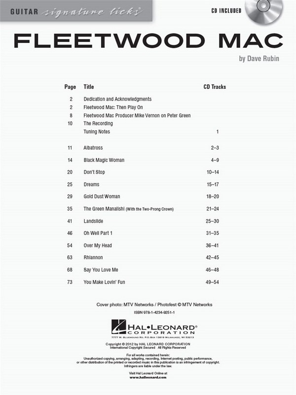 Guitar Signature Licks Series A Step-by-Step Breakdown of the Guitar Styles and Techniques of Lindsey Buckingham and Peter Green Albatross Black Magic Woman Don't stop Dreams Gold Dust Woman The Green Manalishi Landslide Oh Well Part 1 Over my Head Rhiannon Say You love Me You make lovin' Fun