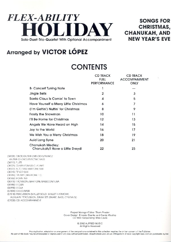 Lopez, Victor, arr. Songs for Christmas, Chanukah and New Year's Eve Jingle Bells Santa Claus is coming to Town Have yourself a merry little Christmas I'M getting nuttin' fo Christmas Frosty the Snowman I'll be Home for Christmas Angels we have heard on high Joy to the World We wish you a merry Christmas Angels we have heard on high Joy to the World We wish you a merry Christmad Auld Lang Syne Chanukah Medley