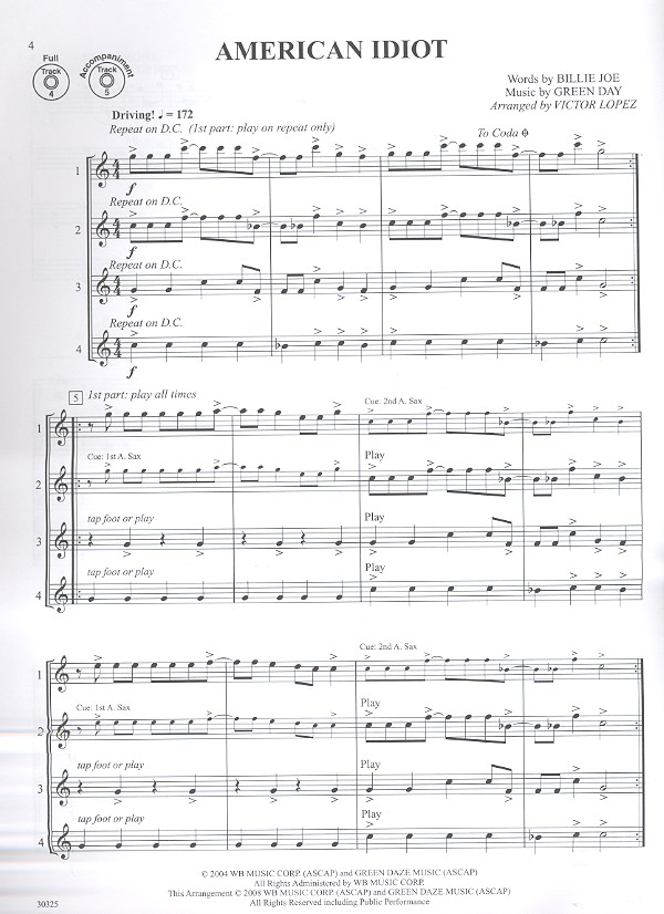 Lopez, Victor, arr. Alegria American Idiot Because of you Boulevard of broken Dreams Gonna fly now (Theme from Rocky) Hedwig's Theme (from Harry Potter and the Sorcerer's Stone) Hips don't lie Jumpin' Jack Flash The New Girl in Town (from Hairspray) We are Family Wonka's Welcome Song (from Charlie and the Chocolate Factory)