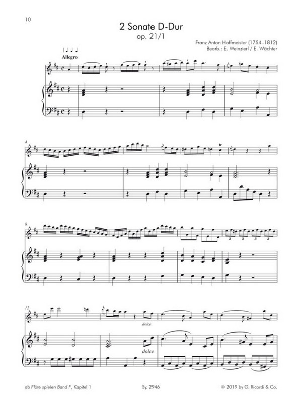 Wächter, Edmund, ed Weinzierl, Elisabeth, ed Die neue Querflötenschule auch für Juniorflöte Spiel- und Vortragsstücke Polonaise de Carafa (Böhm) Sonate D-Dur op.21,1(Hoffmeister) Floreaux (Tango brasileiro) (Nazareth) Scherzetto (Büsser) Romanza siciliana (Weber) Cleopha (Joplin) Andante cantabile (Tchaikovsky) Rossignolet (Donjon) Berceuse (from: Dolly op.16) (Fauré) El Choclo (Villoldo)