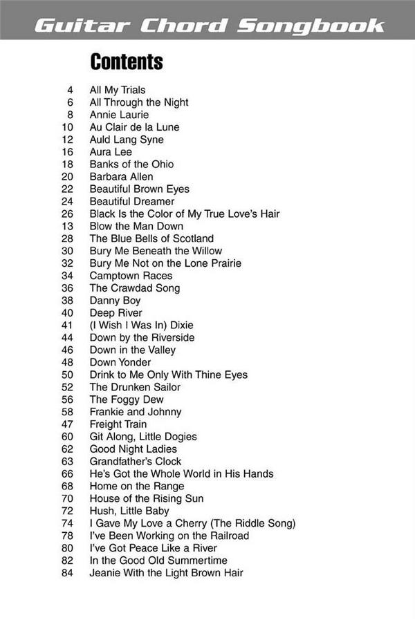 All My Trials All Through The Night Annie Laurie Au Clair De La Lune Auld Lang Syne Aura Lee Banks Of The Ohio Barbara Allen Beautiful Brown Eyes Beautiful Dreamer Black Is the Color of My True Love's Hair Blow The Man Down The Blue Bells Of Scotland Bury Me Beneath The Willow Bury Me Not On The Lone Prairie Camptown Races The Crawdad Song Danny Boy Deep River (I Wish I Was In) Dixie Down By The Riverside Down In The Valley Down Yonder Drink To Me Only With Thine Eyes The Foggy Dew Frankie And Johnny Freight Train Git Along, Little Dogies Good Night Ladies Grandfather's Clock He's Got The Whole World In His Hands Home On The Range House Of The Rising Sun Hush, Little Baby I Gave My Love A Cherry (The Riddle Song) I've Been Working On The Railroad I've Got Peace Like A River In The Good Old Summertime Jeanie With The Light Brown Hair Jesse James John Brown's Body John Henry Joshua (Fit The Battle Of Jericho) Little Brown Jug Lonesome Valley Man Of Constant Sorrow Marianne Matilda Midnight Special Molly Malone (Cockles & Mussels) Mule Skinner Blues My Bonnie Lies Over The Ocean My Old Kentucky Home My Wild Irish Rose Nobody Knows The Trouble I've Seen Old Joe Clark On Top Of Old Smoky Pay Me My Money Down The Red River Valley Rock-A-My Soul Saint James Infirmary Scarborough Fair She'll Be Comin' 'Round The Mountain Shenandoah Sinner Man Sometimes I Feel Like A Motherless Child Streets Of Laredo (The Cowboy's Lament) Sweet Betsy From Pike Swing Low, Sweet Chariot The Drunken Sailor This Little Light Of Mine This Train Tom Dooley Tramp! Tramp! Tramp! Uncle Joe The Wabash Cannon Ball Water Is Wide Wayfaring Stranger When The Saints Go Marching In Worried Man Blues