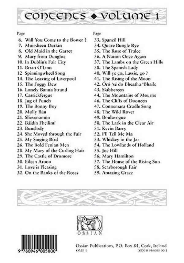 Will you come to the bower Muirsheen durkin Old maid in the garret Mary from dungloe In dublin's fair city Brain o'linn Sprinningwheel song The leyving of liverpool The foggy dew Lonely banna strand Carrickfergus Jug of punch The bonny boy Molly ban Slievenamon Baidin fheilimi Bunclody She moved through the fair My singing bird The bold fenian men