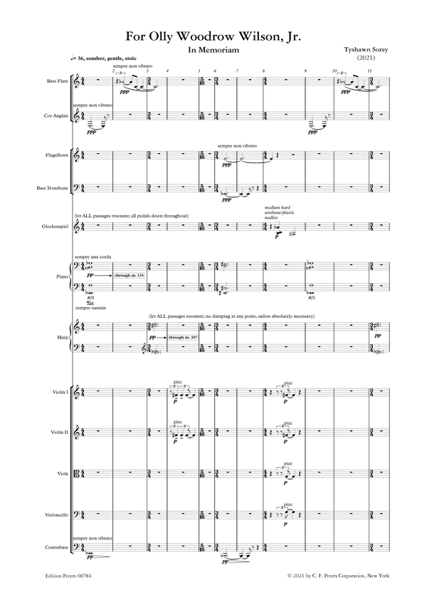 Peters Contemporary Library For Olly Woodrow Wilson, Jr. in memoriam für großes gemischtes Ensemble wurde von Tyshawn Sorey im Auftrag der San Francisco Contemporary Music Players und von Radio France und dem Ensemble Intercontemporain komponiert. Die Uraufführung am 7. Februar 2021 im Maison de la Radio et de la Musique, Paris durch das Ensemble Intercontemporain, dirigiert von Elena Schwarz, wurde mitgeschnitten für eine Übertragung bei Radio France im folgenden März. Olly Wilsons Einfluss ist in dem Stück nicht nur stilistisch hörbar, sondern offenbart sich langsam und kontemplativ über die Dauer des einzigen 20-minütigen Satzes, aber in Form von Tonmaterial, das sich Sorey aus zwei Werken von Wilson geliehen hat und die eine besondere Bedeutung für ihn haben: Akwan und Piece for Four. Die Partitur des Werkes für 16-köpfiges Ensemble (inklusive eines fünfsaitigen Kontrabasses) ist käuflich erhältlich im Rahmen der Peters Contemporary Library. Das Aufführungsmaterial kann geliehen werden.