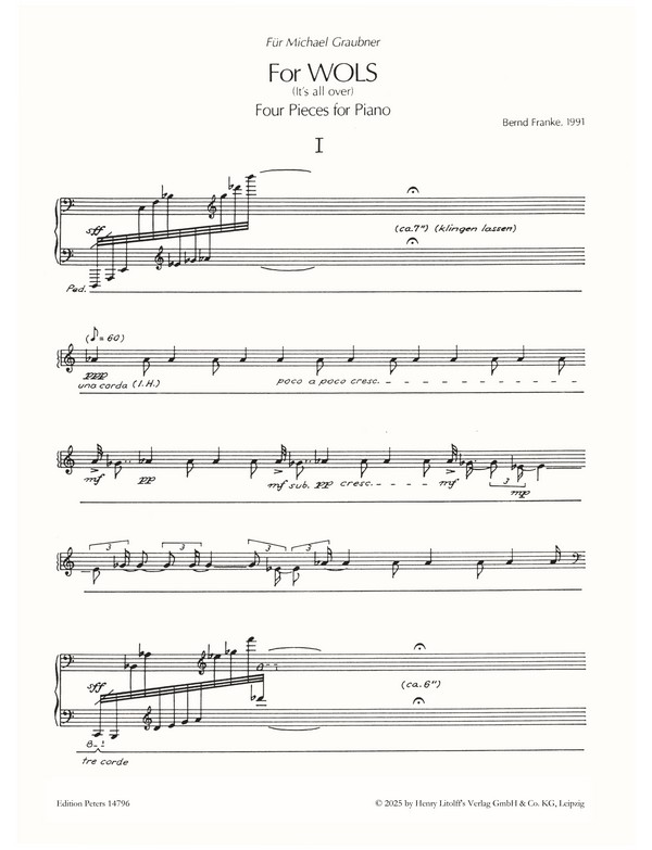 'For Wols was written in 1991 at the suggestion of the Cologne pianist Michael Graubner and commissioned by the Düsseldorf Tonhalle. The premiere took place in Düsseldorf in 1993, and in 1994 For Wols was produced by Hessian Radio. For Wols was produced by Hessischer Rundfunk in 1994. The dedication and subtitle of these four pieces for piano refer to the restless and tragic life as well as various works of the great German abstract painter Wols, who was born Wolfgang Schulze in Berlin in 1913, grew up in Dresden and died prematurely, aged just 38, completely impoverished in Paris. Manfred H. Wenninger, excerpt from a portrait programme on Hessischer Rundfunk in 1996: For Wols (It's all over) is an endgame. But it doesn't lead to a decision like in chess or football game, endgame would be better understood here in Beckett's sense, as an old endgame that has always been lost. Development takes place here, if at all, only in the smallest, often stuttering dimensions, tending to freeze into a point without development. In the end, the ultimate opposition: two opposing voices in widely splayed positions. In an apparent contradiction of seeming static and violent outburst, the two inspiring starting points to which the title alludes are found: the paintings of the painter Wolfgang Schulze, whose abstract works Franke describes as partly filigree-silent, partly violently expressive, as well as Franke's thoughts and feelings during the Gulf War.'