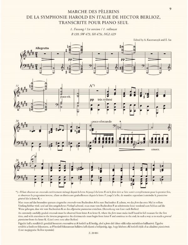 Supplementary Volume 16 of the New Liszt Edition contains free arrangements and technical exercises. In the first section can be found early versions of three arrangements. The first consists of the first and intermediary versions of a transcription of Die Rose, a song Schubert composed to a poem by Schlegel. The arrangement of the second movement of Berlioz's Harold Symphony also draws on literary inspiration: Lord Byron's (1788-1824) narrative poem Childe Harold's Pilgrimage (1812-18) was a literary experience Liszt shared with Berlioz. The fantasy on themes from Bellini's opera La sonnambula [The Sleepwalker] (here the first version of 1842, and the second version dating from the following decade are given) is important in music history because it was while he worked on this (and other operatic fantasies) that Liszt developed a new concept of the form, which took shape in more complex and more concentrated fantasies than before. Particularly interesting material can be found in the appendix. In addition to sketches and drafts for arrangements of Spanish themes, there are three sources published here for the first time, which shed light on technical aspects of Liszt's piano teaching. These are three sets of exercises: the first written by Liszt himself for Valérie Boissier in 1832, the second a copy in an unidentified hand from the same period or slightly later, and finally the third which was noted down in 1871 by Henri Maréchal in Rome based on the composer's dictation. This latest volume of the New Liszt Edition includes a detailed preface in German, English, and Hungarian containing new research findings, together with five manuscript facsimiles and critical notes. Simultaneously with the cloth-bound Complete Edition, a practical paperback version has been published, the contents of which are identical to those of the hardcover edition, minus the inclusion of critical notes.