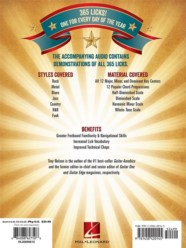 A 52-Week One-Lick-Per-Day Method This revolutionary approach to chord-tone soloing features a 52-week, one-lick-per-day method for visualizing and navigating the neck of the guitar. Rock, metal, blues, jazz, country, R&B and funk are covered. Topics include: all 12 major, minor and dominant key centers, 12 popular chord progressions, half-diminished and diminished scales, harmonic minor and whole-tone scales, and much more. Written by Troy Nelson, author of the #1 bestseller Guitar Aerobics and former editor-in-chief of Guitar One