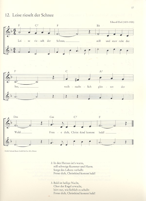 Beliebte Weihnachtslieder in leichten Sätzen Alle Jahre wieder Engel lassen laut erschallen Es ist ein Ros' entsprungen Es ist für uns eie Zeit angekommen Fröhliche Weihnacht überall Ihr Kinderlein Kommet Joseph, lieber Joseph mein Jingle Bells Kling, Glöckchen Kommet, ihr Hirten Lasst uns froh und munter sein Leise rieselt der Schnee Morgen, Kinder, wird's was geben Morgen kommt der Weihnachtsmann O du fröhliche, o du selige O Heiland, reiß die Himmel auf O Tannenbaum Rudolph, the re-nosed reindeer Stille Nacht, heilige Nacht Vom Himmel hoch, da komm ich her Winter Wonderland Wir sagen euch an