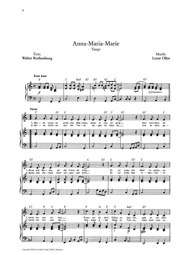 Anna-Maria-Marie Auch in der Liebe braucht man große Ferien Bimmelbahn-Jim Das arme Fischermädchen Der Beduinenscheich Der schönste Tango meines Lebens Dicht am Äquator Die Seemannsbraut Dschungel Du warst mir gleich so vertraut Duschenkas Herz Ein Lied von Liebe spielt der Zigeuner Einsame Herzen Es leuchtet ein Stern Ich sing heute vergnügt vor mich hin Ich tute Im Sommer blühn wieder die Rosen Maddalen Matrosen-Tango Mister Bobo Na wie stehn wir da Nach Java mocht ich fahren Paloma Paloma Rosen aus dem Süden Sehnsucht Schau die Welt ist so weit Ueber den Dächern von Hamburg Warum Wie wär's denn
