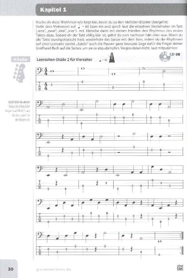 mit Grifftabelle Ganz ohne Vorkenntnisse kannst du mit GARANTIERT BASS LERNEN das E-Bassspiel erlernen. Von Anfang an werden hier mit Hilfe von Noten, Tabulaturen, anschaulichen Griffbildern und Fotos die Grundlagen für das Bassspiel gelegt. Für ein erfolgreiches Lernen sind vor allem klare Strukturen und kleine, logisch aufeinander aufbauende Lernschritte notwendig. Mit GARANTIERT BASS LERNEN wirst du dir - neben Tipps zu Basskauf und Equipment - die technischen Grundlagen des E-Bassspiels (Haltung, Anschlag, Saitenwechsel, Greifen) und die spezielleren Spieltechniken wie Dead Notes, Hammer Ons, Pull Offs und Slides einfach erarbeiten. Schritt für Schritt geht es auf der rhythmischen Ebene von Viertelnoten über Achtel- bis hin zu Sechzehntelnoten. Auch Triolen, die ternäre Rhythmik und das Spiel in verschiedenen Taktarten gehören dazu. Neben den technischen und rhythmischen Grundlagen steht aber auch der Erwerb eines grundlegenden, harmonischen Handlungswissens im Vordergrund, das notwendig ist, um eigene Basslinien zu bilden. Das reicht vom Spiel mit den reinen Grundtönen, über die Verwendung von Akkordtönen und Skalen (Dur, Moll und Pentatoniken) bis zu diatonischen und chromatischen Durchgängen. In jedem der acht Kapitel gibt es neben vielen Übungen und Groovebeispielen auch je zwei Spielstücke aus ganz unterschiedlichen Stilistiken wie Rock, Pop, Funk, Soul, Blues, Rhythm & Blues, Jazz, Hip Hop, Ska, Reggae, Surf und Country. Außerdem noch acht Play-Alongs zum Mitspielen, an denen du deine eigenen Ideen entwickeln kannst. Zusätzliche Groove Analysen beleuchten das Zusammenspiel von Bass und Schlagzeug im Bandkontext und runden das Gesamtkonzept von GARANTIERT BASS LERNEN schlüssig ab.