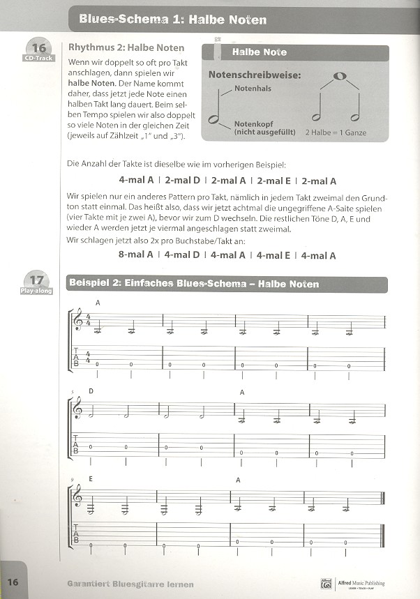 Der ultimative Einsteigerkurs für Akustik- und E-Gitarre Blues Diese systematische Methode ist der ultimative Einsteigerkurs für Akustik- und E-Gitarre. Sie vermittelt spielerisch leicht alles Wichtige zum Thema Bluesgitarre und zeigt die angesagtesten Riffs und Grooves im Stile von Eric Clapton, BB King, John Lee Hooker, Muddy Waters, Freddie King, Otis Rush, The Beatles, ZZ Top, Gary Moore u.v.a. Blues-Schemata, Blues-Stile und spezielle Spieltechniken werden in Noten, Tabulatur und Griffdiagrammen vorgestellt und sowohl im Buch als auch auf der Moderations-CD erläutert. Song- und CD-Empfehlungen, die Wahl der richtigen Bluesgitarre- & Verstärkertypen u.v.m. runden dieses methodisch kleinschrittige Konzept ab. Mehr Infos und Internetunterstützung gibt es auf: www.garantiert-bluesgitarre.de