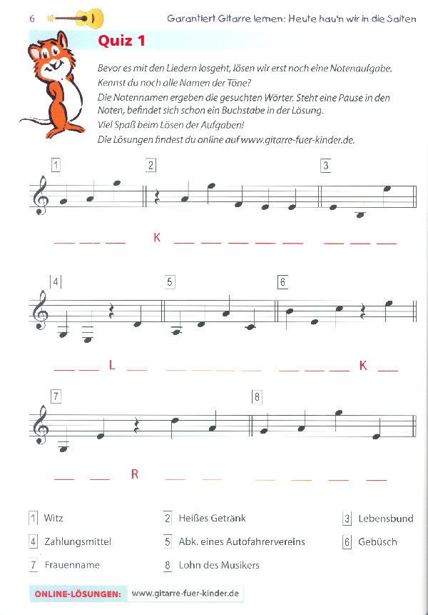 für Kinder Das Spielbuch zur Bestseller-Methode 75 Songs für Melodiespiel und Begleitung GARANTIERT GITARRE LERNEN FÜR KINDER ist eine der erfolgreichsten Gitarrenschulen für Kinder ab sechs Jahren. Seit mehr als zehn Jahren lernen junge Einsteiger mit dieser bewährten Methode in zwei systematisch aufeinander aufbauenden Bänden. Mit HEUTE HAU'N WIR IN DIE SAITEN! liegt jetzt das dazugehörige Spielbuch vor, das insgesamt 75 Lieder enthält, die das Spielmaterial aus den beiden ersten Bänden sinnvoll ergänzt. Egal, ob du auf der Gitarre gerne Melodien spielst oder mit Akkorden begleitest: alle Lieder verwenden den Tonraum der ersten Bünde der Gitarre sowie viele dir bereits bekannte Akkordgriffe, Zupfmuster und Rhythmen. Neben den neuen Liedern gibt es in diesem Spielbuch aber noch eine ganze Menge mehr zu entdecken: der neue Ton A auf Saite 1, neue Begleitakkorde, neue Zupfmuster/Rhythmen, neue Duostücke. Ein paar Quizaufgaben musst du natürlich auch lösen und mit der beiliegenden CD kannst Du Dir anhören, wie die 75 Lieder auf der Gitarre klingen sollen. Du hast keinen CD-Player zur Verfügung? Kein Problem! Die Hörbeispiele stehen auch online zur Verfügung. Olli, die Gitarrenmaus. wünscht dir viel Spaß und Erfolg mit HEUTE HAU'N WIR IN DIE SAITEN!
