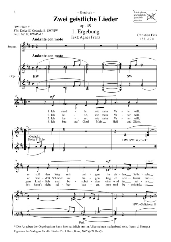 Sologesang mit Instrumenten und Orgel Band 94 Ergebung op,49,1 Dulde Christ des Lebens Leiden op.49,2 Sorge nicht op.51,1 Still mit Christus op.51,2 Wenn der Herr ein Kreuze schickt op.51,3 Ich folge Jesu nach op.52,3 Passionslied op.58,4 Nachtgebet op.58,4 Herr strafe mich nicht in deinem Zorn op.60 Sei du mit mir op.62,1 Gottvertrauen op.62,2 Passion op.62,3