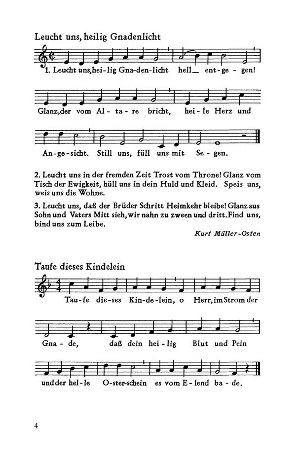 Ich glaube an den einen Gott Leucht uns heilig Gnadenlicht Taufe dieses Kindelein In dem Herren freuet euch Ob alle Welt verginge (Psalm 46) Es mag sein dass alles fällt Gott unsre Herzen Licht Meerstern ich dich grüße Maria neig dich meinem Lied Wir harren Christ in dunkler Zeit Nun vergesst der Traurigkeit Wisst ihr noch wie es geschehen O Kindlein das Maria hält Lasst eure bittren Klagen sein Zur stillen Nacht Mein Hirt vernahmst du schon Es lagen im Felde die Hirt vernahmst du schon Es lagen im Felde die Hirten bei Nacht Mit Schall von Zungen Au fauf die ihr geschlafen Jahr dein Haupt neig Werde österlich mein Herz Wir danken Herr für Brot und Kleid Herr nun sei dir Lob gesungen Erwacht in neuer Stärke Weil jetzo alles stille ist Wenn ins Land die Wetter hängen Komm Trost der Welt Die Sonne sinkt von hinnen Noch hinter Berges Rande (Abendsegen)