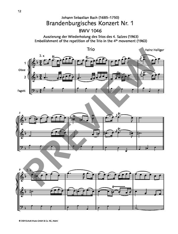 Collected Cadenzas, Entrances and Embellishments zu Oboenkonzerten aus Barock und Klassik for Oboe Concertos of the Baroque and Classical Era Solokonzerte Solo Concertos Tomaso Albinoni (16711750): Concerto a cinque op. IX, No. 2 in d-Moll für Oboe und Streicher / in D minor for Oboe and Strings Johann Sebastian Bach (16851750): Brandenburgisches Konzert Nr. 1 (BWV 1046) Trio Carl Philipp Emanuel Bach (17141788): Konzert für Oboe, Streichorchester und Basso continuo (Wq. 164, H466) in B-Dur / in Bb major, Konzert für Oboe, Streicher Cnd Basso continuo (Wq. 165) in Es-Dur / in Eb major Johann Christian Bach (17351782): Oboenkonzert Nr. 2 (C81) in F-Dur / in F major Johann Gottlieb Graun (1701/021771): Konzert für Oboe, Streichorchester und Basso continuo (Wi 119) in c-Moll / in C minor Franz Xaver Richter (17091789): Konzert für Oboe und Orchester in F-Dur / in F major Carl Ditter von Dittersdorf (17391799): Concerto (Lane L. 41) in G-Dur / in G major, Concerto (Lane L. 42) in G-Dur / in G major Antonio Rosetti (17501792): Konzert für Oboe und Orchester (Murray C. 30) in C-Dur / in C major Josef Fiala (17481816): Konzert für Englischhorn und Orchester (eský hudební fond, Prag) in Es-Dur / in Eb major Joseph Haydn (17321809) zugeschrieben / attributed to Joseph Haydn: Konzert für Oboe und Orchester (Hob. Vllg: C1) in C-Dur / in C major Ludwig August Lebrun (17521790): Konzert Nr. 1 für Oboe und Orchester in d-Moll / in D minor, Konzert Nr. 2 für Oboe und Orchester in g-Moll / in G minor, Konzert Nr. 3 für Oboe und Orchester in C-Dur / in C major, Konzert Nr. 4 für Oboe und Orchester in B-Dur / in Bb major, Konzert Nr. 5 für Oboe und Orchester in C-Dur / in C major, Konzert Nr. 6 für Oboe und Orchester in F-Dur / in F major Wolfgang Amadeus Mozart (17561791): Konzert für Flöte (Oboe) und Orchester (KV 313 (285c)) in F-Dur / in F major, Konzert für Oboe und Orchester (KV 314 (285d)) in C-Dur / in C major, Andante für Flöte und Orchester (KV 315) in C-Dur / in C major, Oboenquartett (KV 370) in F-Dur / in F major