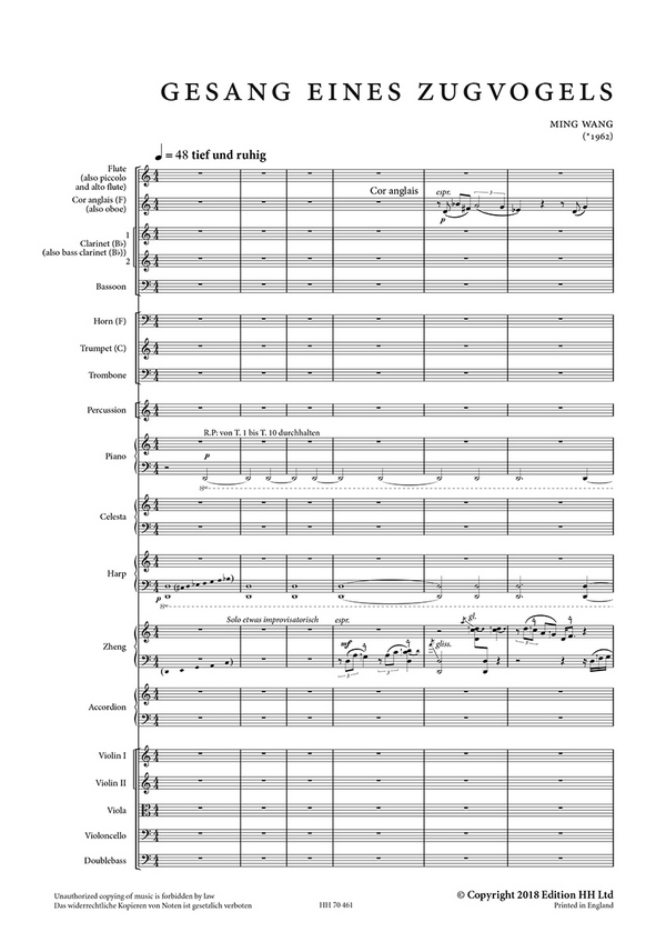 When the composer was flying to her homeland of Taiwan from her home in Vienna, a poetic image emerged quite spontaneously: she felt like a migratory bird, flying year after year 10,000 kilometres away from Vienna over the Alps and across Eastern Europe, Arabia, Russia, the Mongolian steppes, the Tibetan plateau, South-East Asia and the Pacific in order to spend the cold winter in the Southern Hemisphere in spring she once again fly 10,000 kilometres to the north. During this flight her imagination plays with the different landscapes: what could a migratory bird espy from its ?bird?s perspective?? In this composition Ming Wang brings together or unite many different sounds and musical elements that symbolize the various geographical regions. These disparate elements are held together by a few central notes, fixed harmonic structures, a ?migratory bird theme?, a ?Europe theme? and a ?13-note row?. The Chinese arched zither or Zheng represents an exotic bird that by chance has landed in this Western ensemble