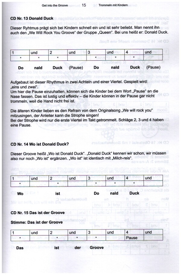 Dieses Buch richtet sich an alle interessierte Eltern, Pädagog*innen und Erzieher*innen. Ich möchte Mut machen, den Groove selbst zu entdecken und an die Kleinen weiterzugeben! Man hört oft: Ich kann keine Noten lesen. Also kann ich meinem Kind auch nicht das Trommeln beibringen! Falsch: Um mit diesem Buch zu arbeiten, braucht man keinerlei Notenkenntnisse. Die Noten werden im Verlauf des Buches von alleine gelernt. Die Kinder brauchen keine Vorerfahrung. Es spielt auch keine Rolle, ob mit einem Kind oder einer Gruppe von Kindern getrommelt wird. In Kindergärten, Kindertagesstätten und Schulen habe ich immer wieder erfahren, dass Erzieher*innen und Lehrer*innen gerne mit Kindern trommeln wurden. Sie wissen nur nicht, wie sie vorgehen sollen, weil sie selbst keine Trommel- Expert*innen sind. An diesem Punkt setzt dieses Buch an. Kinder und Erwachsene lernen beide durch dieses Buch die Grundlagen des Trommelns. Es empfiehlt sich, zunächst alleine damit zu arbeiten. Das schafft Sicherheit und bietet Orientierung. Habe Spaß daran, die Welt der Rhythmen zu entdecken! Sei mutig und bleib dran! Übertrage deine Begeisterung auf die Kinder, denn wer selbst begeistert ist, kann andere begeistern! In diesem Buch und auf der CD werden folgende Instrumente genutzt: A go go bell, Djembe, Surdo, Bongos, Conga, Cowbell, Cabasa, Claves, Cajon Boomwhackers und arabische Trommel.