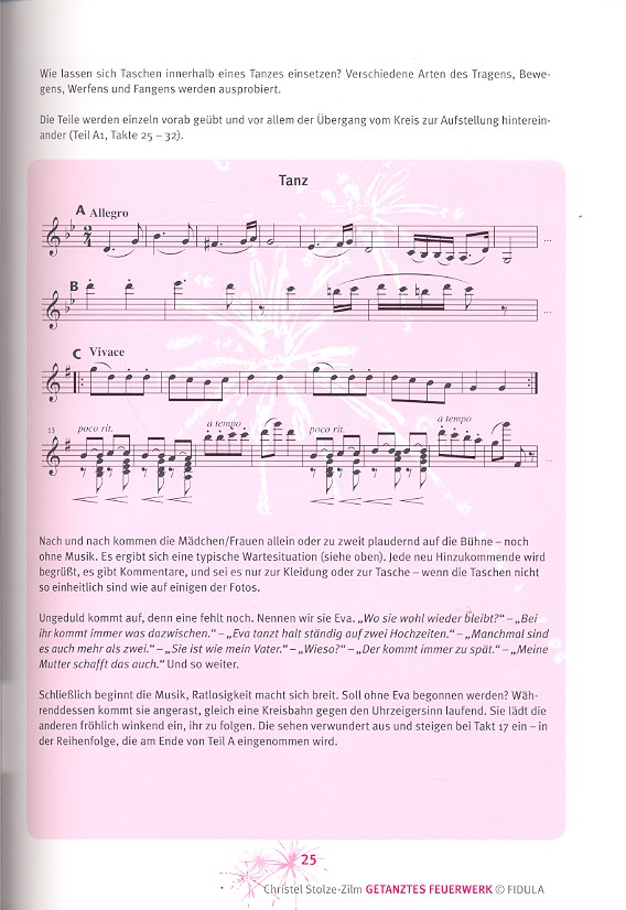 Ein Feuerwerk zündender Tanzideen bietet Christel Stolze-Zilm in ihrem nun schon dritten Buch für Musik- und Tanzlehrer und alle, die mit Gruppen jeden Alters arbeiten: in der Grundschule, Sekundarstufe, im Verein, in Gemeinden und in der Tanzschule. Vorschläge für themenorientierte Auftritte ungewöhnliche Choreographien für alle Alters- und Zielgruppen geeignet für unterschiedliche Anlässe und Gruppengrößen etliche Sitz- und Stehtänze, die wenig Platz benötigen preiswerte und teilweise witzige Alltagsgegenstände als attraktive Requisiten zusätzliche Versionen vieler Tänze, die auch ohne Requisiten Freude bereiten effektvolle Ideen für das Tanzen mit Schwarzlicht ein Märchen, in das fast alle Tänze integriert werden können. Die Musikauswahl reicht von traditioneller Musik aus vielen Ländern über klassische Musik von Bach, Brahms, Händel (alle Tänze aus der Feuerwerksmusik), Mozart, Offenbach und Tschaikowsky bis hin zu Ragtime, Boogie und Rock 'n' Roll. Die beigefügte CD enthält 30 Musiken für über 60 Tänze und Tanzspiele.