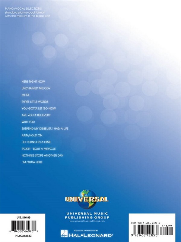 Here right now Unchained Melody More Three little Words You gotta let go now Are You a Believer With You Suspend my Disbelief - I had a Life Rain - Hold on Life turns on a Dime Talkin' 'bout a Miracle Nothing stops another Day I'm outta here