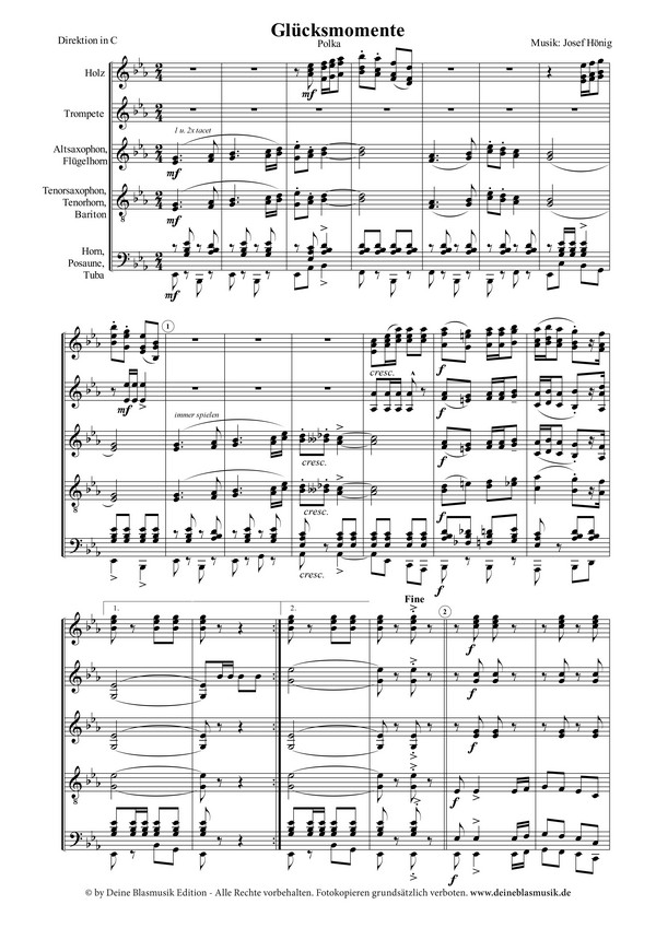 Polka Bei einem ausgedehnten Waldpaziergang in herbstlicher Stimmung kann es gut vorkommen, dass man einmal sentimental wird und über das Leben philosophiert, das doch bei den meisten Menschen von der Suche nach dem großen Glück geprägt ist. So ging es auch Josef Hönig, der so die Idee zu seiner Polka "Glücksmomente" hatte. Das Besondere an dieser Polka ist, dass sie weder böhmisch noch mährisch ist, aber trotzdem diese Stilistiken mit der eigenen des Autors vereint und zu einem Werk verschmilzt, das gute Laune verbreitet und "Glücksmomente" schafft.