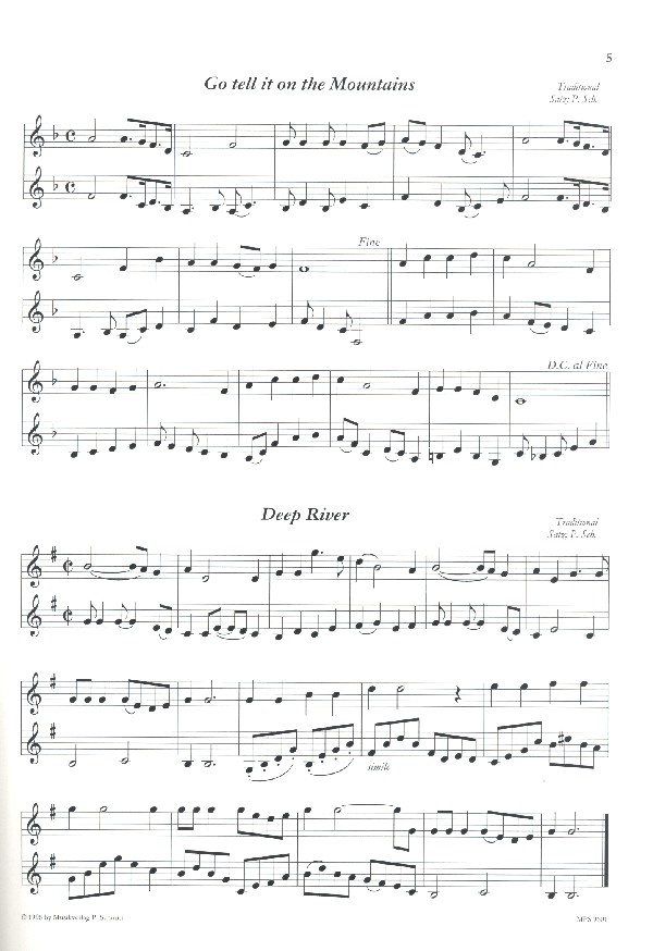 20 Spirituals, Gospels und Negrofolksongs Go tell it to the Mountains Deep River Joshua fit the Battle of Jericho Oh Freedom Down by the Riverside Swing low, sweet Chariot Nobody knows the Trouble They crucified my Lord By and by Amazing Grace Oh Mary don't you sweep Were you there Kumbayah my Lord Standin' in the Need of Prayer Sometimes I feel like a motherless Child Whisper a Prayer Climb up Children He's got the whole World in his Hand The Heaven is shining full of Love