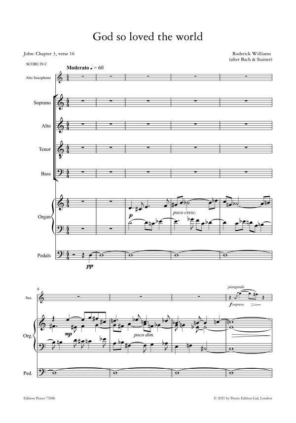 God so loved the world by Roderick Williams is an anthem for SATB choir (with divisi), organ and Alto saxophone, using the same biblical text (John 3:16) which is famously used by John Stainer in his work The Crucifixion. Roderick Williams uses Stainer?s anthem as the starting and end point for the choir, introducing and developing the Christus character portrayed by both Stainer and J.S. Bach in his Passions to powerful effect. It was commissioned by saxophonist Sam Corkin as part of the Palimpsest project at Canterbury Cathedral and was first performed at the Canterbury Festival in October 2022.