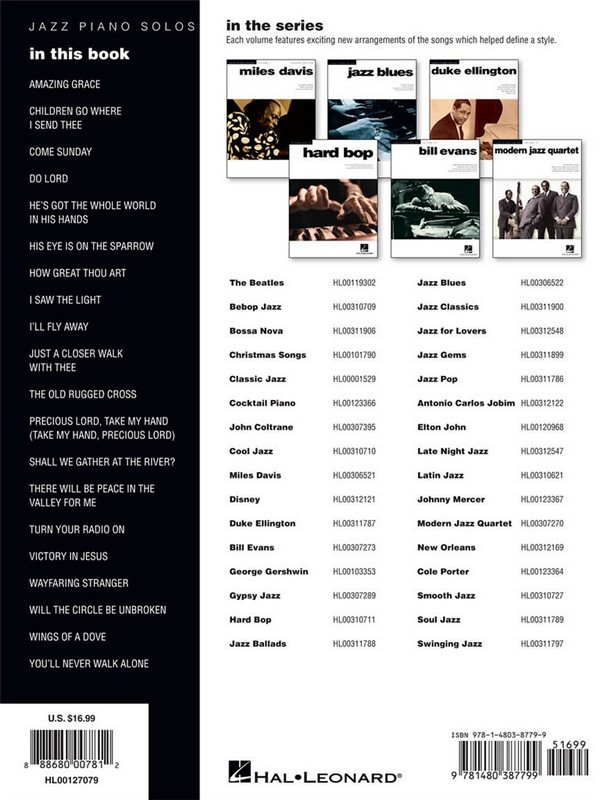Jazz Piano Solos vol.33 Amazing Grace Children Go Where I Send Thee Come Sunday Do Lord He's Got The Whole World In His Hands His Eye Is On The Sparrow How Great Thou Art I Saw The Light I'll Fly Away Just A Closer Walk With Thee The Old Rugged Cross Precious Lord, Take My Hand (Take My Hand, Precious Lord) Shall We Gather At The River? There Will Be Peace In The Valley For Me Turn your radio on Victory In Jesus Wayfaring Stranger Will The Circle Be Unbroken Wings Of A Dove You'll Never Walk Alone