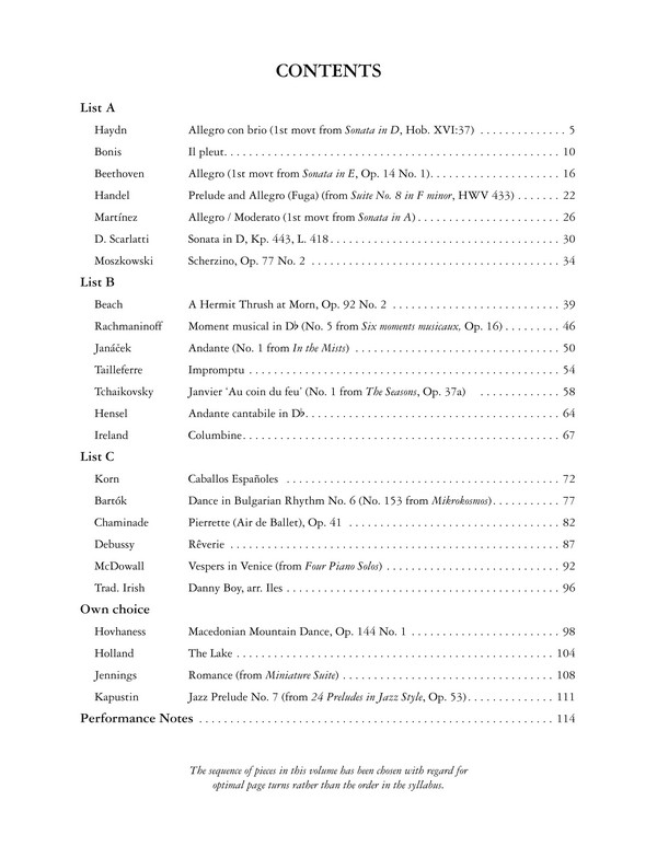 The Edition Peters Grade 8 Piano Anthology comprises a selection of pieces from lists A, B and C of the Associated Board piano syllabus for 2025-26, together with several pieces suitable for the own-choice section of the Performance Exam. The anthology supports students preparing for either the Practical Exam or the Performance Exam and is accompanied by Performance Notes which give advice on technique and interpretation for each piece. The pieces in this volume are drawn from the extensive range of piano music in the Edition Peters catalogue. Allegro con brio, 1st movt from Sonata in D, Hob. XVI:37 (Haydn) Il pleut (Bonis) Allegro, 1st movt from Sonata in E, Op. 14 No. 1 (Beethoven) Prelude and Allegro (Fuga), 1st and 2nd movts from Suite No. 8 in F minor, HWV 433 (Handel) Allegro/Moderato, 1st movt from Sonata in A (Martínez) Sonata in D, Kp. 443, L. 418 (Scarlatti) Scherzino, Op. 77 No. 2 (Moszkowski) A Hermit Thrush at Morn, Op. 92 No. 2 (Beach) Moment musical in Db, Op. 16 No. 5 (Rachmaninoff) Andante, No. 1 from In the Mists (Janáek) Impromptu (Tailleferre) Janvier Au coin du feu, No. 1 from The Seasons, Op. 37 (Tchaikovsky) Andante cantabile in Db (Hensel) Columbine (Ireland) Caballos Españoles (Korn) Dance in Bulgarian Rhythm No. 6, No.153 from Mikrokosmos (Bartók) Pierrette (Air de Ballet), Op. 41 (Chaminade) Rêverie (Debussy) Vespers in Venice, from Four Piano Solos (McDowall) Danny Boy (Iles) Macedonian Mountain Dance, Op. 144 No. 1 (Hovhaness) The Lake (Holland) Romance, from Miniature Suite (Jennings) Prelude in Jazz Style No. 7, from 24 Preludes in Jazz Style, Op. 53 (Kapustin)
