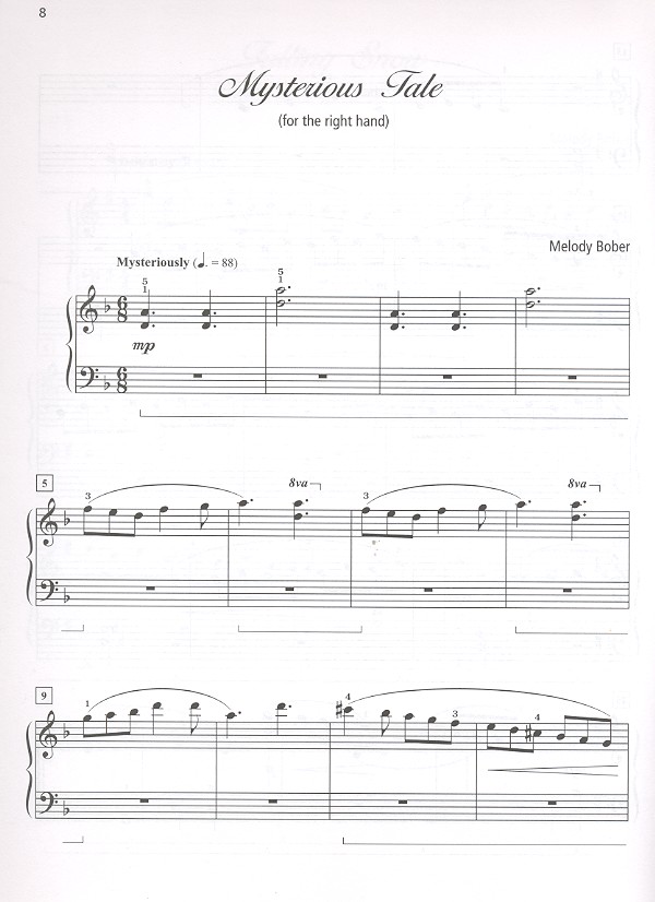 8 late elementary Pieces for right or left Hand alone Morning Ride New Chopsticks Falling Snow Mysterious Tale Treasure Hunt Left-Hand Boogie Stomp Blues Beat Climbing the Cascades