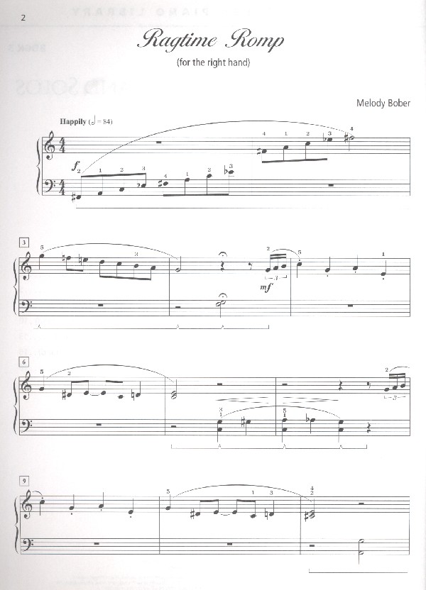Melody Bober Piano Library for right or left Hand alone Ragtime romp Trumpet call Dance at Twillight Chaconne in E minor Malagueña mood Whispers in the wind Bassline Bravo Skater's dream