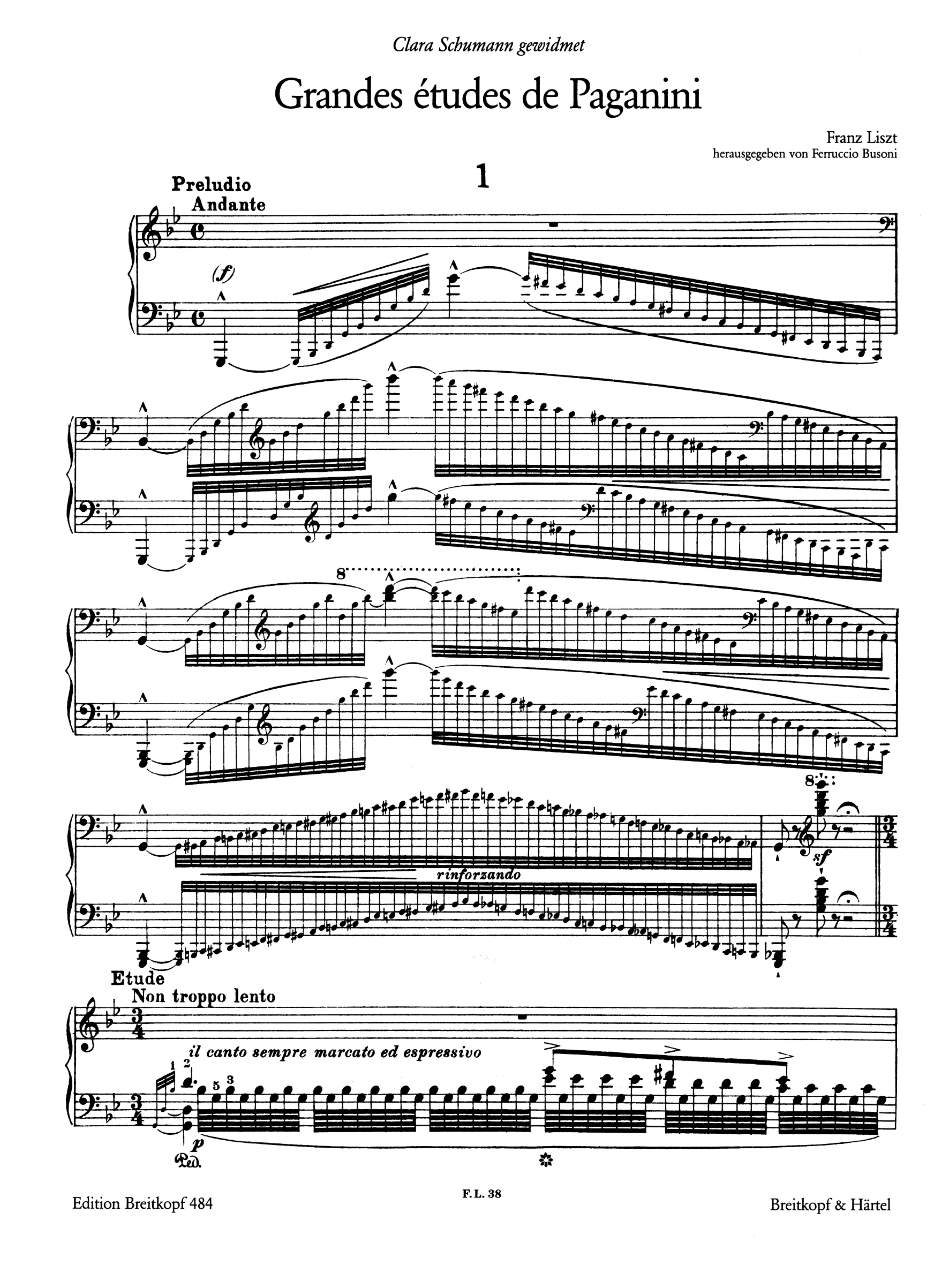 6 große Etüden nach Paganini Busoni, Ferruccio, ed Auf zwei Etüden der Sammlung sei dabei besonders hingewiesen: Nr. 3 La Campanella (Das Glöckchen) erlangte wegen des außergewöhnlichen Klangcharakters besondere Bekanntheit. Und in der abschließenden a-moll-Etüde stellt sich Liszt mit seinen Variationen über das berühmte Capricen-Thema Paganinis in eine Reihe mit vielen anderen Komponisten. Die Erstausgabe der Einrichtung der sechs Etüden durch den Pianisten und Komponisten Ferruccio Busoni erschien bei Breitkopf & Härtel in Einzelheften zwischen 1914 und 1923.