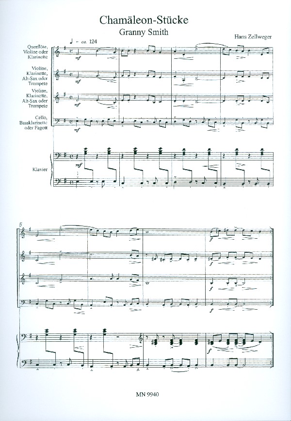 Chamäleonstücke Enthaält Stimmen für Flöte, Violine, Violoncello, Klainette, Baßklarinette, Fagott, Trompete in B/C/Es, Altsaxophon