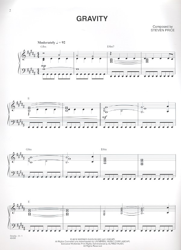 from the Motion Picture Acclaimed director Alfonso Cuarón's Gravity features a pulse-pounding score to accompany the film's intense and groundbreaking special effects. Now, pianists can play the powerful main theme with this collectible sheet solo. The music has been faithfully arranged to authentically capture the score for this blockbuster film.