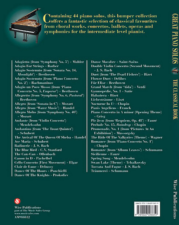 Adagietto from Symphony no.5 (Mahler) Adagio for Strings (Barber) Adagio sostenuto from Moonlight Sonata (Beethoevn) Adagio sostenuto form Piano Concerto no.2 (Rachmaninoff) Adagio un poco mosso from Piano Concerto no.5 (Beethoven) Allegretto from Symphony no.6 (Beethoven) Allegro from Sonata in C (Mozart) Allegro from Water Music (Händel) Allegro molto from Symphony no.40 (Mozart) Andante from Violin Concerto (Mendelssohn) Andantino from The Trout Quintet (Schubert) The Arrival of the Queen of Sheba (Händel) Ave Maria (Schubert) Badinerie (Bach) The Blue Bird (Stanford) Can-Can (Offenbach) Canon in D (Pachelbel) First Movement from Cello Concerto (Elgar) Clair de Line (Debussy) Dance of the Hours (Ponchielli) Dance of the Knights (Prokofieff) Danse macabre (Saint-Saens) Second Movement from Double Violin Concerto (Bach) Duet from The Pearl Fishers (Bizet) Flower Duet (Delibes) Für Elise (Beethoven) Grand March from Aida (Verdi) Gymnopédie no.1 (Satie) Habanera (Bizet) Liebestraum (Liszt) Nocturne in Es (Chopin) Panis Angelicus (Franck) Opening Theme from Piano Concerto in a Minor (Grieg) Pie Jesu from Requiem op.48 (Fauré) Prelude no.15 Raindrop (Chopin) Promenade no.1 from Pictures at an Exhibition (Mussorgski) Theme of the Ride of the Valkyries (Wagner) Romance from Piano Concerto no.1 (Chopin) Romance from Album Leaves (Schumann) Sicilienne (Fauré) Spring Song (Mendelssohn) Theme from Swan Lake (Tschaikowsky) Toccata and Fugue (Bach) Träumerei (Schumann)