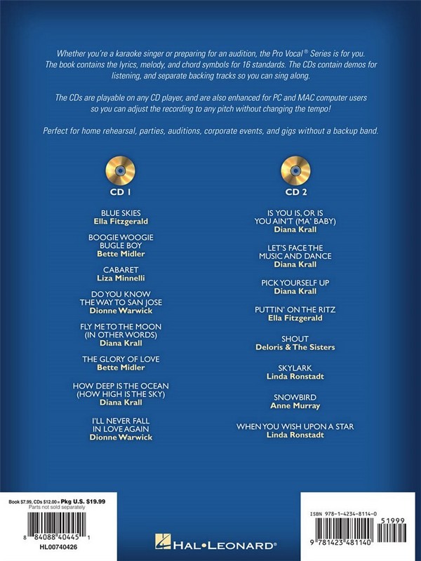 Pro Vocal Series vol.51 - Better than Karaoke CD with unique Pitch-Changer Blue Skies (Betsy) Boogie Woogie Bugle Boy (Buck Privates) Cabaret (Cabaret) Do You Know The Way To San Jose Fly Me To The Moon (In Other Words) (Once Around) The Glory Of Love (Guess Who's Coming To Dinner) How Deep Is The Ocean (How High Is The Sky) I'll Never Fall In Love Again (Promises, Promises) Is You Is, Or Is You Ain't (Ma' Baby) (Follow The Boys) Let's Face The Music And Dance (Follow The Fleet) Pick Yourself Up (Swing Time) Puttin' On The Ritz (Puttin' On The Ritz) Shout (Sister Act) Skylark Snowbird When You Wish Upon A Star (Pinocchio)