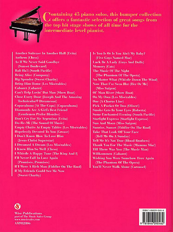 Another Suitcase In Another Hall (Evita) Anthem (Chess) As If We Never Said Goodbye (Sunset Boulevard) Bali Ha'i (South Pacific) Being Alive (Company) Big Spender (Sweet Charity) Bring Him Home (Les Miserables) Cabaret (Cabaret) Can't Help Lovin' Dat Man (Show Boat) Close Every Door (Joseph And The Amazing Technicolor Dreamcoat) Copacabana - At The Copa (Copacabana) Diamonds Are A Girl's Best Friend (Gentlemen Prefer Blondes) Don't Cry For Me Argentina (Evita) Do-Re-Mi (The Sound Of Music) Empty Chairs At Empty Tables (Les Miserables) Hopelessly Devoted To You (Grease) I Don't Know How To Love Him (Jesus Christ Superstar) I Dreamed A Dream (Les Miserables) I Know Him So Well (Chess) I Whistle A Happy Tune (The King And I) I'll Never Fall In Love Again (Promises, Promises) If I Were A Rich Man (Fiddler On The Roof) If My Friends Could See Me Now (Sweet Charity) Is You Is Or Is You Ain't My Baby (Five Guys Named Moe) Luck Be A Lady (Guys And Dolls) Memory (Cats) The Music Of The Night (The Phantom Of The Opera) No Matter What (Whistle Down The Wind) Now That I've Seen Her - Her Or Me (Miss Saigon) Ol' Man River (Show Boat) On My Own (Les Miserables) One (A Chorus Line) Pick A Pocket Or Two (Oliver) Smoke Gets In Your Eyes (Roberta) Some Enchanted Evening (South Pacific) Starlight Express (Starlight Express) Sun And Moon (Miss Saigon) Sunrise, Sunset (Fiddler On The Roof) Take That Look Off Your Face (Tell Me On A Sunday) Tell Me It's Not True (Blood Brothers) Thank You For The Music (Mamma Mia) Till There Was You (The Music Man) Willkommen (Cabaret) Wishing You Were Somehow Here Again (The Phantom Of The Opera) You'll Never Walk Alone (Carousel)