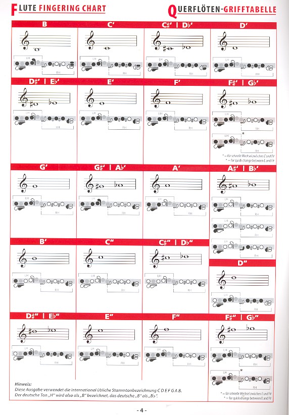 Fingering Chart Trillertabelle Tonumfang Pflegetipps Ansatztipps Alfred's Grifftabelle für Flöte ist die zweisprachige (Deutsch und Englisch), umfassende und zugleich kompakte Sammlung der wichtigsten Griffe und Spieltechniken auf der Querflöte. Neben den gängigen Normalgriffen findet der Querflöteninteressierte Alternativgriffe und Pianissimogriffe, spezielle Trillergriffe und weitere nützliche Zusatzinformationen zu Pflege, Tonumfang, Ansatz, speziellen Bauformen wie Ringklappenflöte und H-Fuß-Flöte sowie Übungen zur Überblastechnik. Alles auf 12 Seiten zusammengestellt und bebildert unter der Mitwirkung von Klaus Dapper. Ein ausführliches Nachschlagewerk ideal für Anfänger und Wiedereinsteiger!