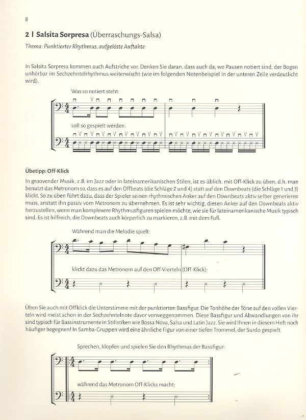 Lateinamerikanische Grooves auf dem Cello Mit der Groovestrich-Schule führt Susanne Paul in die faszinierende Welt der lateinamerikanischen Musik ein. In 15 mitreissenden Spielstücken und reichhaltigem Übematerial stellt sie typische Rhythmik und den Groovestrich vor - eine spezielle Strichart, die in grooveorientierter Musik wie Samba, Bossa Nova, Salsa, Jazz, Rock oder Bluegrass verwendet wird. Dies ist ein idealer Einstieg zum Grooven auf dem Cello, und hilfreich auch für jeden, der sich für Jazz-Improvisation auf dem Cello interessiert. Inhalt: Einleitung und Übetipps 1 Bossa-Fanfare - Thema: Viertel und Achtel 2 Salsita Sorpresa - Thema: Punktierter Rhythmus, aufgelöste Auftakte 3 Vorweg-Merengue - Thema: Vorgezogene 4 Hipo Barroco - Thema: Auftakte zur Offachtel sowie Saitenwechsel (»Schluckauf«-Figur) 5 Panama Panama Kuba - Thema: Einfache Dreierüberlagerung, Pattern (a) 6 Chile Mexiko Mexiko - Thema: Einfache Dreierüberlagerung, Pattern (b) 7 Speedy G - Thema: Einfache Synkopen 8 Los Gemelos - Thema: Mischung verschiedener bereits behandelter Figuren 9 Blue Guajeo - Thema: Durchgehende/komplexe Synkopen gegen punktierte Bassfigur 10 Guajeo-Duett - Thema: Durchgehende/komplexe Synkopen und längere Pausen 11a Salsita Cubana - Thema: Kubanische Clave gegen Panama-Panama-Kuba-Figur 11b Salsita Cubana mit Tumbao-Rhythmus - Thema: Kubanische Clave gegen Tumbao 12 Bossa Brasileira - Thema: Brasilianische Clave-Figur gegen punktierte Bassfigur 13 Wellen-Salsa - Thema: Patterns und 16tel-Ketten gegen punktierte Bassfigur 14 Que pasa? - Thema: Variierte Patterns und 16tel-Ketten, auch im Bass 15 Minutenbossa - Thema: Wechsel zwischen Groovestrich & »normalen« Stricharten (lange Töne)