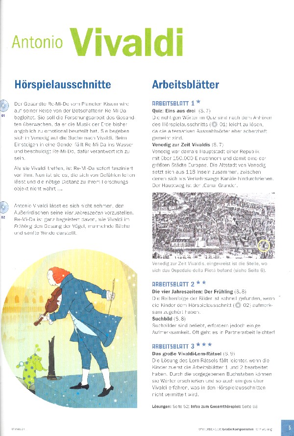 Vivaldi, Bach, Händel, Haydn, Mozart, Beethoven, Schubert, Schumann Die farbig illustrierte Kopiervorlagensammlung enthält Spiel-, Rätsel- und Aufgabenseiten für Kinder ab 7 Jahren. Diese sind auf der beiliegenden CD mit altersgerechten Hörspielszenen zu acht berühmten Meistern der Musikgeschichte (Vivaldi, Bach, Händel, Haydn, Mozart, Beethoven, Schubert, Schumann) verknüpft. Die kompakten Lehrerkommentare bieten interessante Zusatzinformationen und didaktische Impulse.
