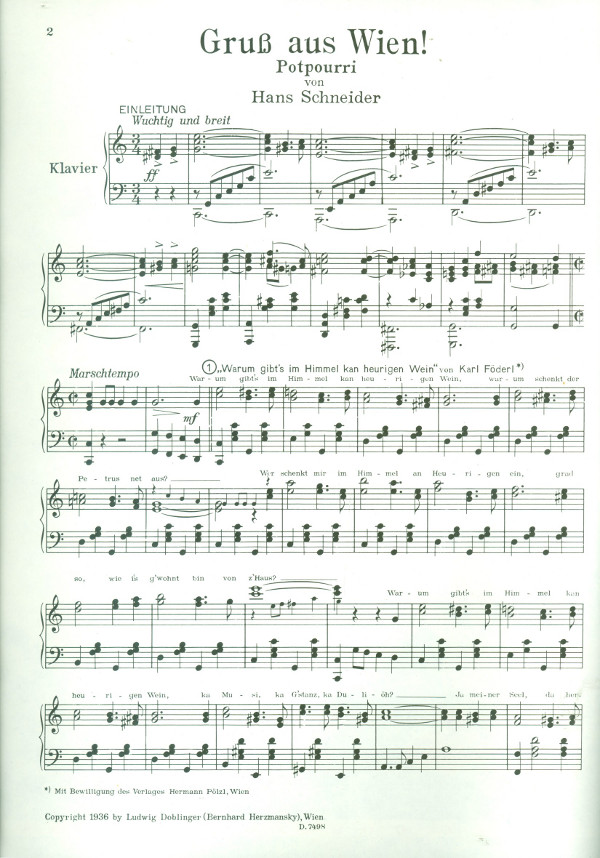 Warum gibt's im Himmel kan heurigen Wein Mir hat heut tramt es gibt kan Wein mehr Wo a greans Kranzerl hängt Wiener Nonbons Schrammeln spielt's mir no an Tanz Heut kommen d'Engerln auf Urlaub Da fangt der alte Stefansturm zum Plaudern an Kinder so jung kumm ma nimmermehr z'samm 99er Regimentsmarsch Pikanterien Erst wann's aus sein wird I kenn kan neid