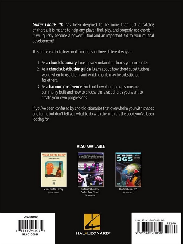 Guitar Educational Over 800 Common Chords, Plus Helpful Music Theory Sections More than just a catalog of chords, this book is designed to help any player find, play and properly use chords. It will quickly become a powerful tool and an important aid to your musical development. The book functions in three different ways: 1) As a chord dictionary look up any unfamiliar chords you encounter 2) As a chord substition guide learn about how chord substitutions work, when to use them and which chords may be substituted for others 3) As a harmonic reference find out how chord progressions are commonly built and how to choose the exact chords you want to create your own progressions. If you've been confused by chord dictionaries that overwhelm you with shapes and forms but don't tell you what to do with them, this is the book you've been looking for!